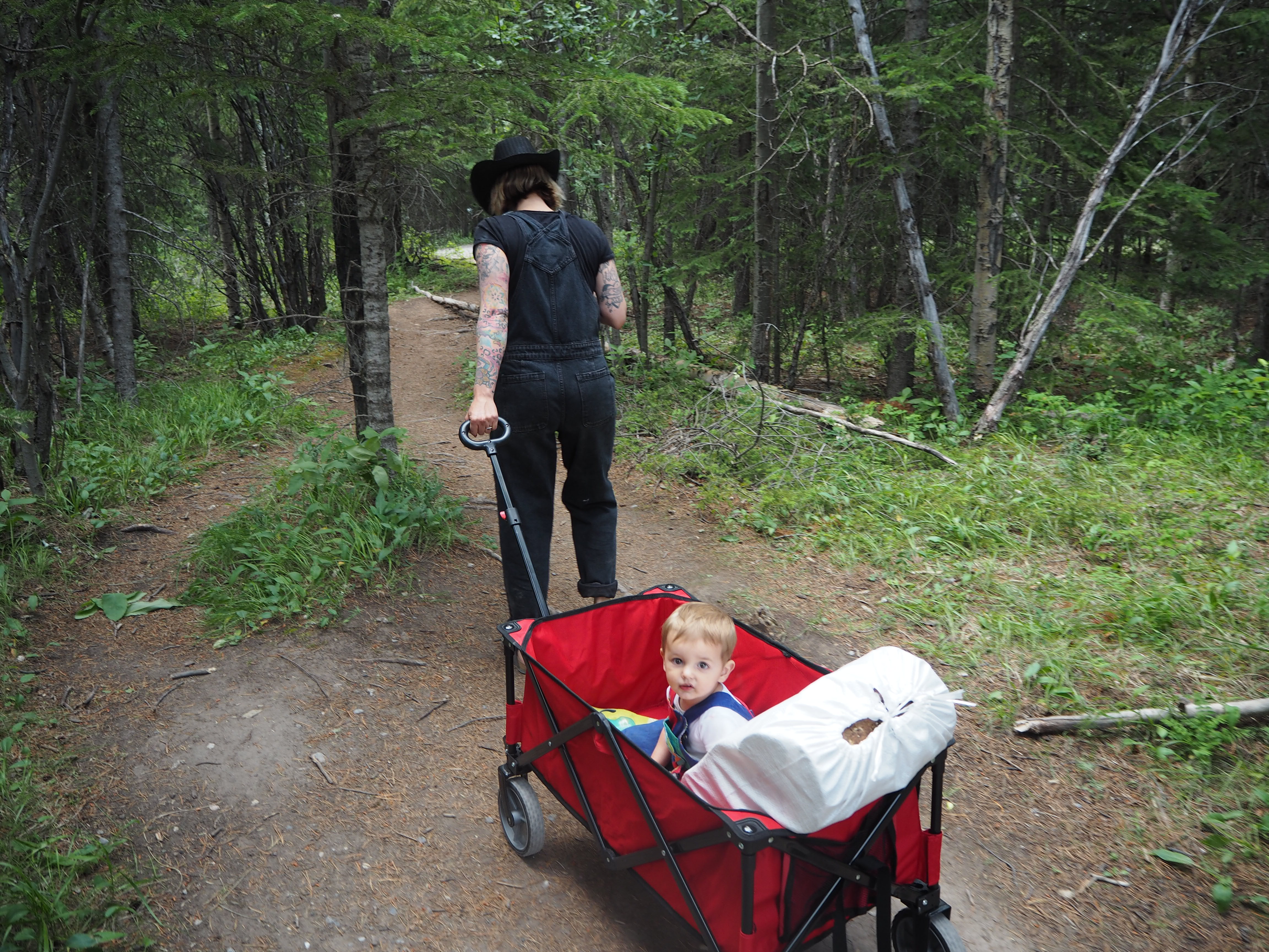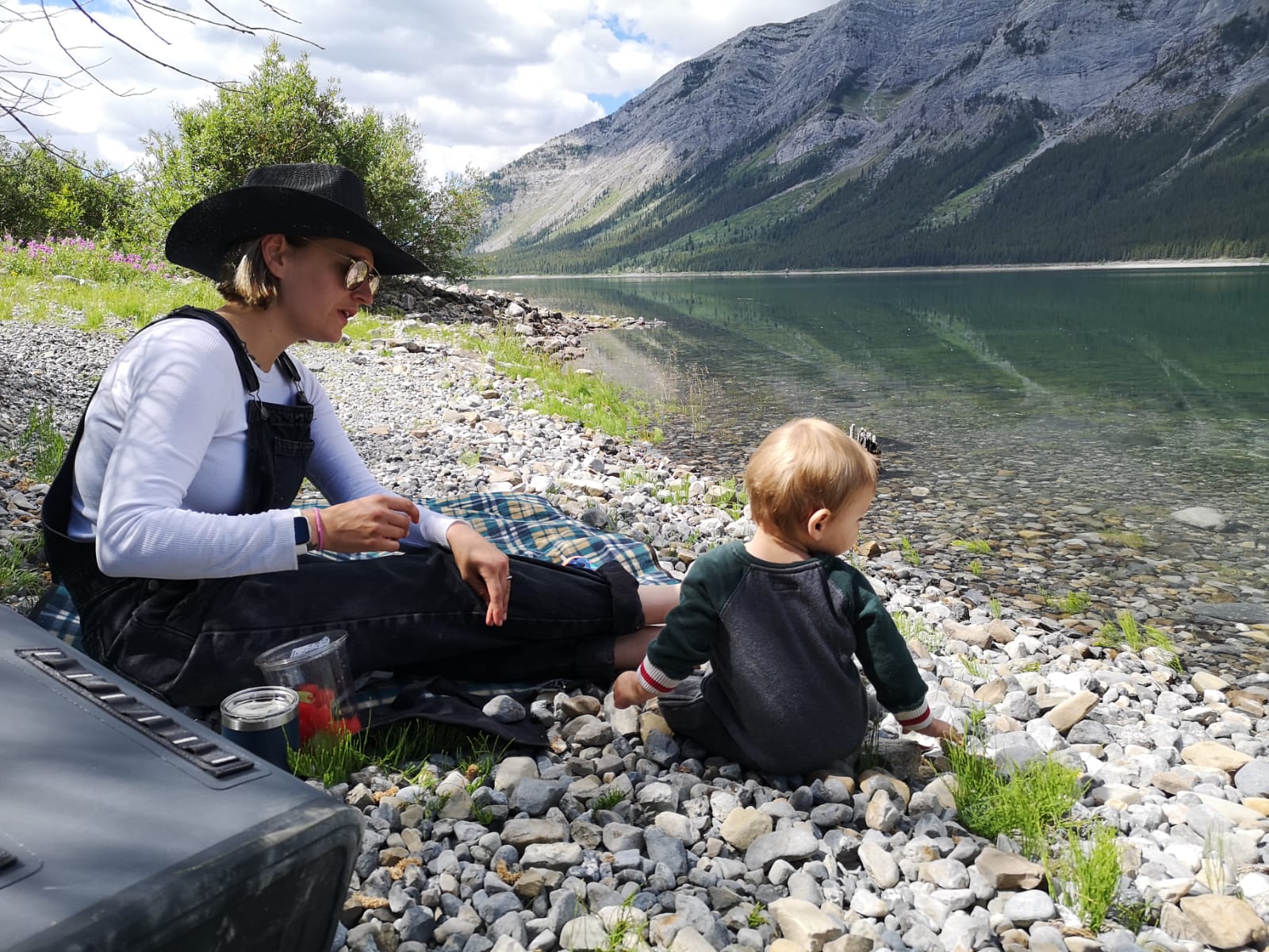In the evening we could not hear anything. It was great. Very quiet and relaxing. There are lots of little chipmunks running around which Rocket loved. One thing we would recommend is bear spray! Kananaskis is very rural and this campsite has nothing around it. When Rocket had gone to bed Henry and I were sat outside having a well-deserved beer. We were playing frisbee and our disk got thrown in to a ditch. I must have wandered around 10 meters from our tent in to the ditch to find it and out of nowhere a HUGE Black bear came bumbling out of the bushes. It could only have been 4 meters from me! My panicked shriek made Henry rush over and just like that the bear was gone. I think we scared each other.
