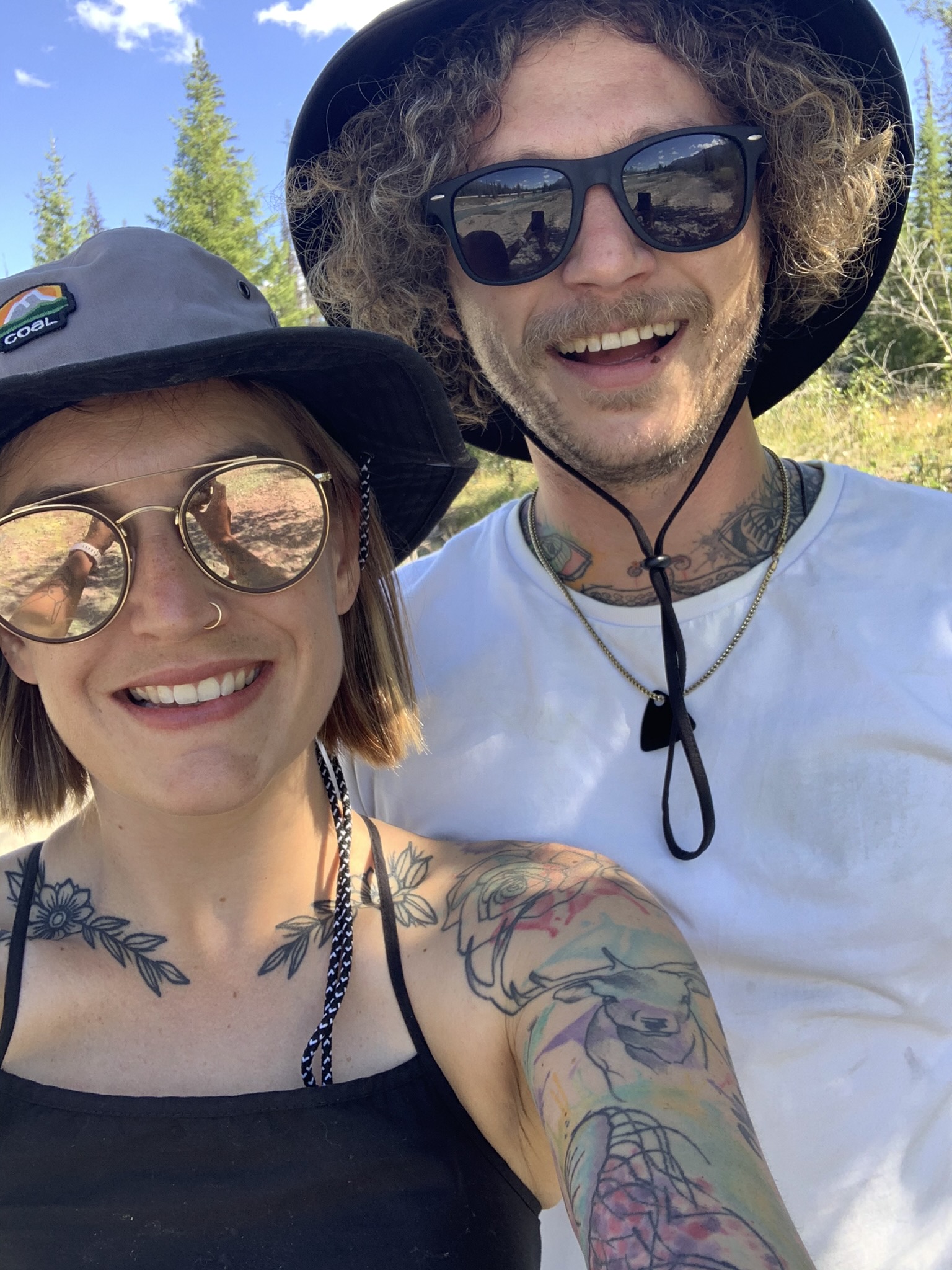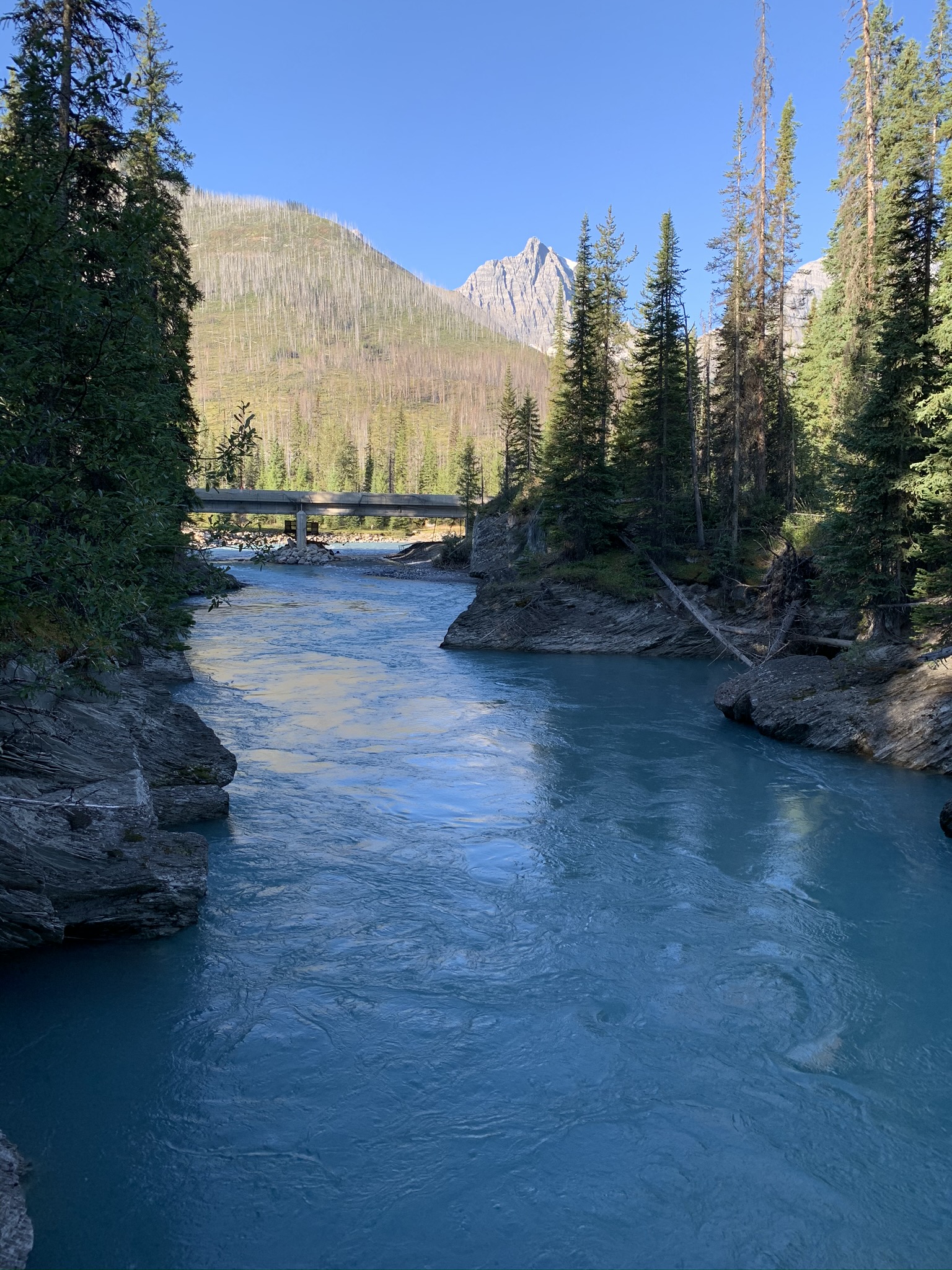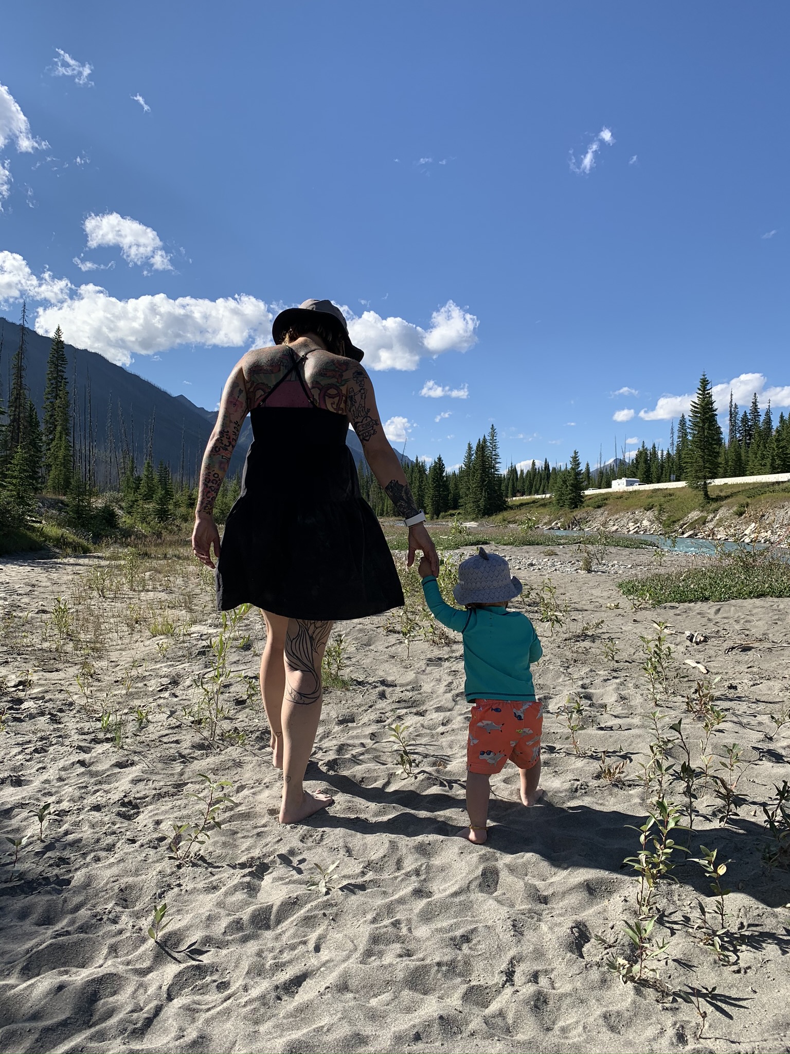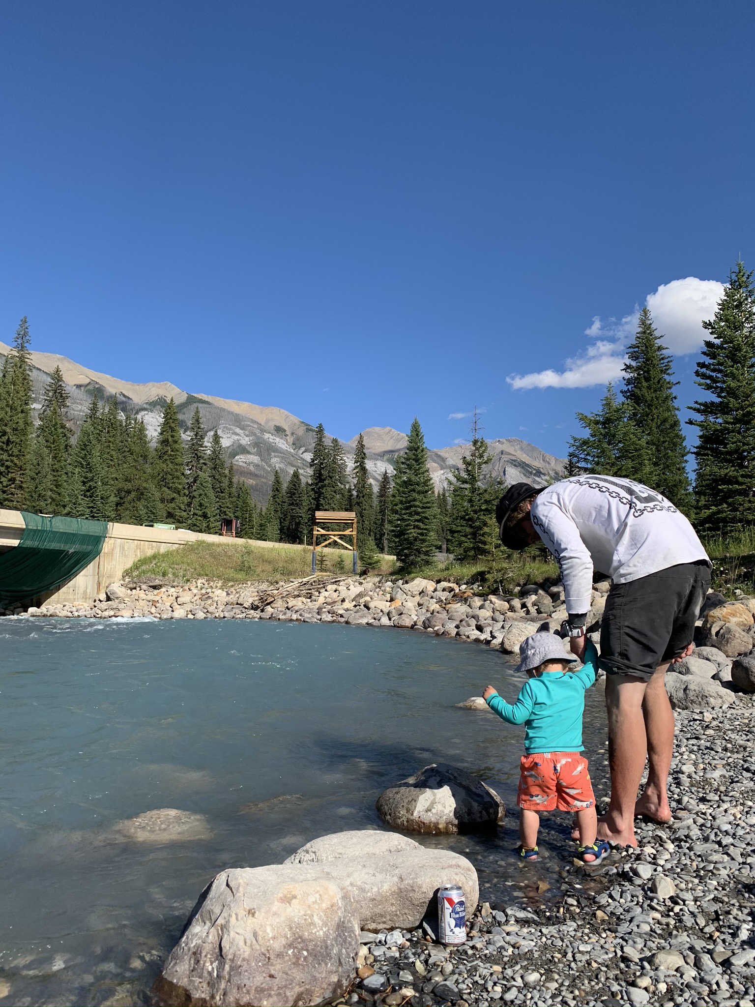 The next morning after a very comfy and warm night sleep, we went exploring. We are all early risers in our family. 6am is usually the time we get up, so after a nice coffee and biscuits in bed we loaded up the back pack and went exploring behind the cabins (away from the highway) and thank goodness we did. Easily one of the most beautiful places I have seen in the Rockies. There is a path that the owners have made out through the woods, around the creek and following the river and it is stunning. The crystal blue river water gently flowing down below us, the sun shining through the trees. The complete silence. It was stunning. We wandered through the woods for a good hour with rocket in the back pack carrier. Lifting Nacho up over the bigger rocks, and skimming stones when the water’s edge got closer.