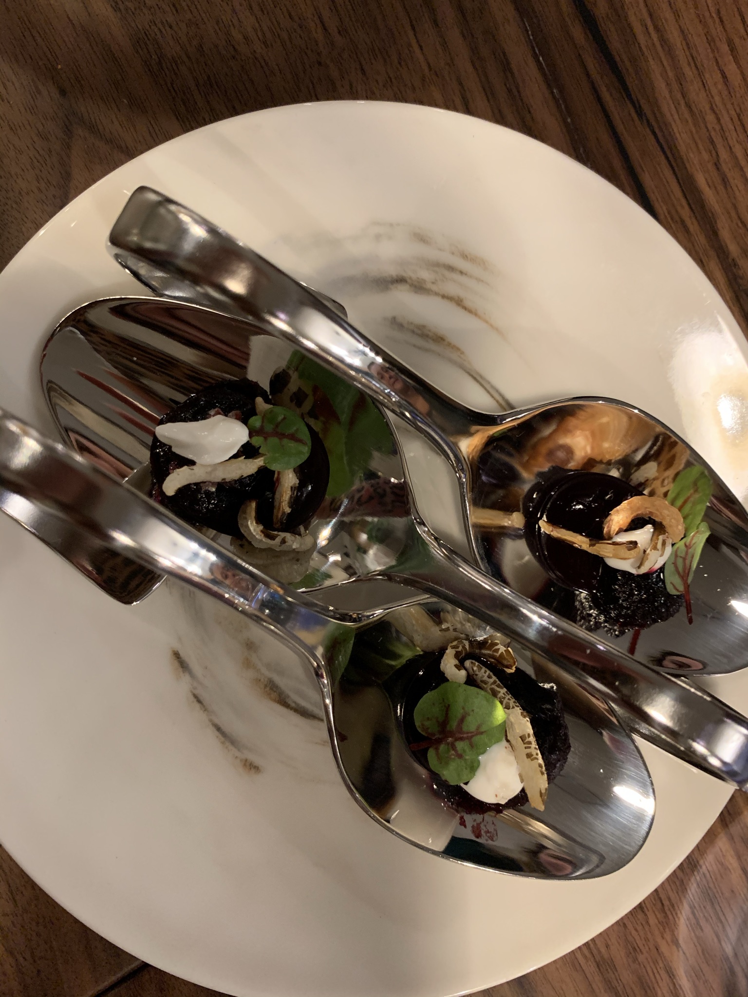 On arrival we were presented with a delicious little Amuse-bouche of pickled beetroot with a little cheese and other flavours (Part of the fun of the evening is always guessing what is in things) Served on a stunning oyster spoon on some beautiful rustic plates that had us all googling where we could get our own set.